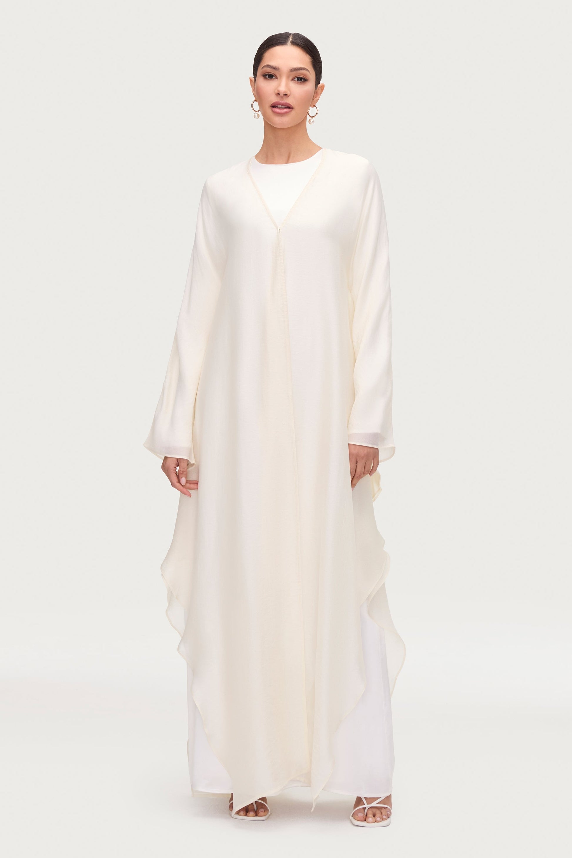 Indulge in luxury and grace with our Ahlam Silk Abaya & Dress Set in Moonbeam. Elevate your style with our ethereal textured silk abaya outer, designed to drape you in elegance. Paired with a flowy, matching inner dress, this is the ultimate statement for any occasion.