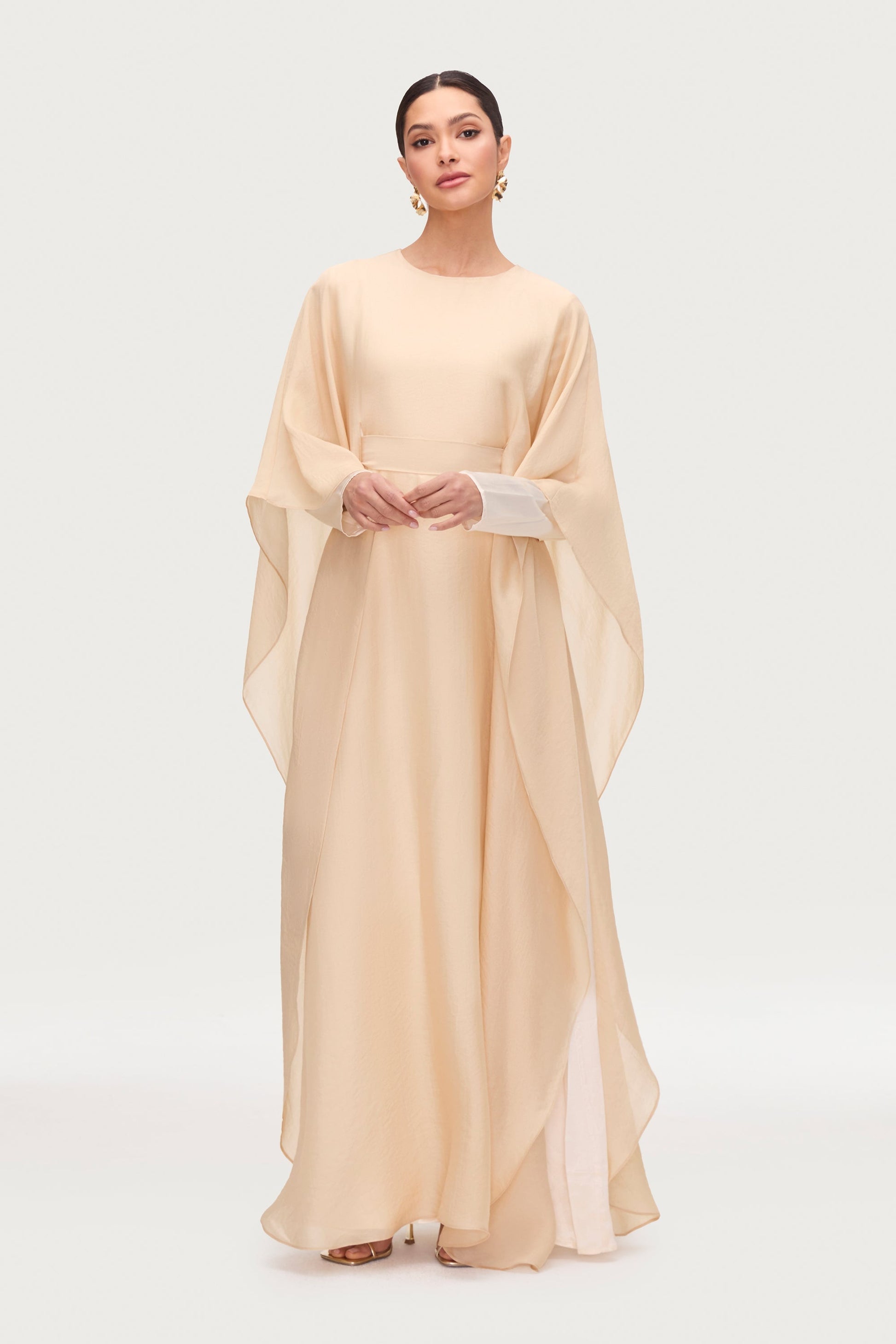 Embrace ethereal elegance with our Ethereal Silk Tie Waist Maxi Dress in stunning Champagne. This luxurious dress features a flowy cape overlay and textured silk fabric, creating a dreamy look. The adjustable tie waist adds a flattering touch, making it the perfect choice for any special occasion.