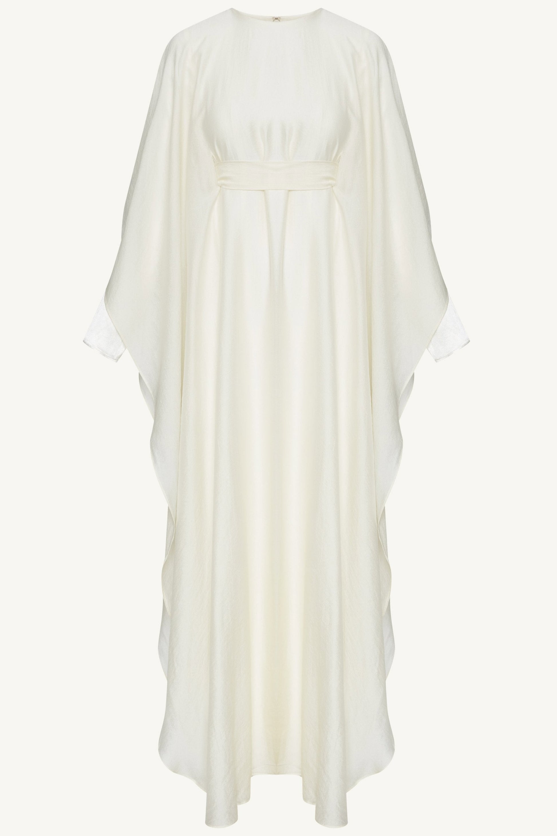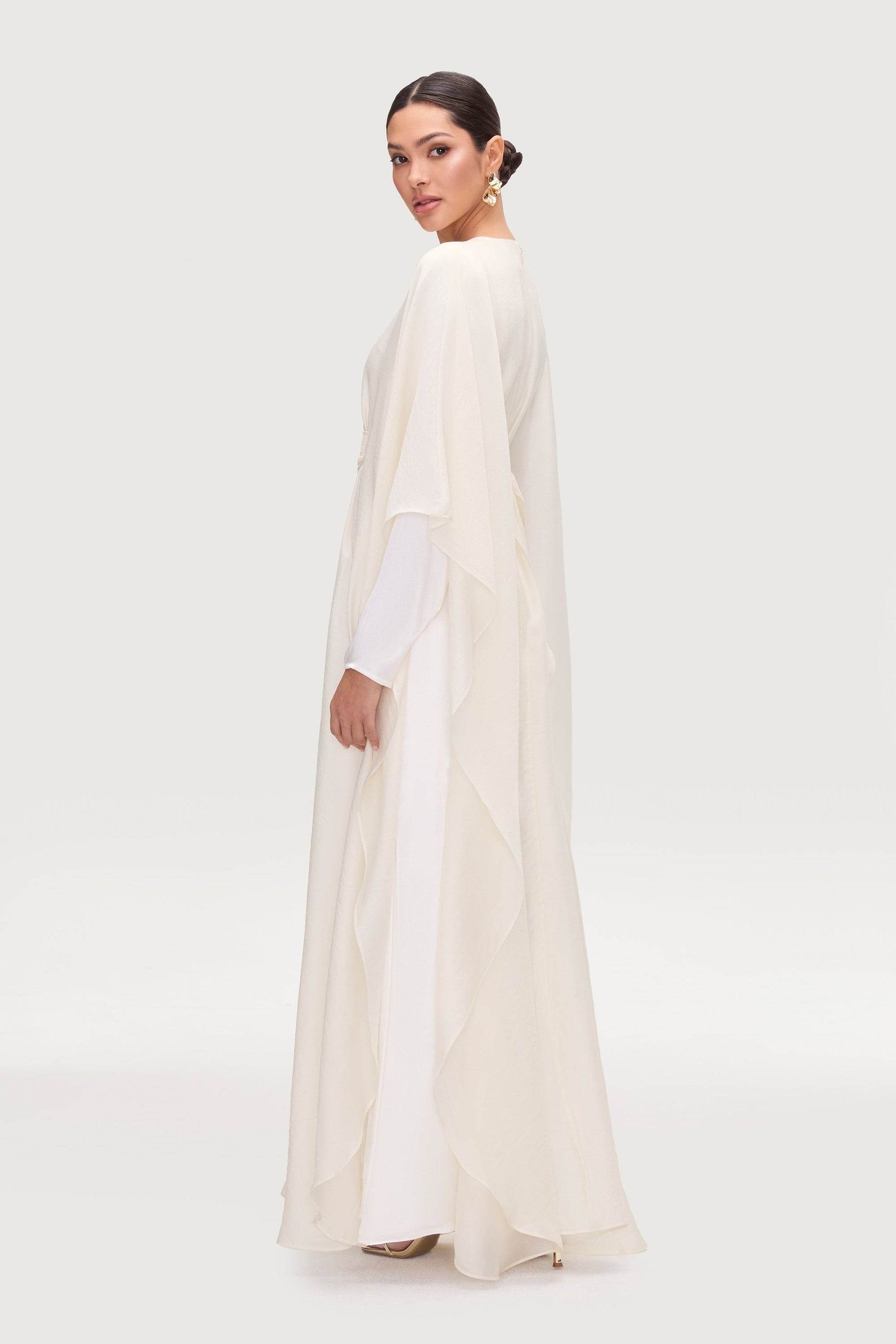 Embrace ethereal elegance with our Ethereal Silk Tie Waist Maxi Dress in stunning Moonbeam. This luxurious dress features a flowy cape overlay and textured silk fabric, creating a dreamy look. The adjustable tie waist adds a flattering touch, making it the perfect choice for any special occasion.