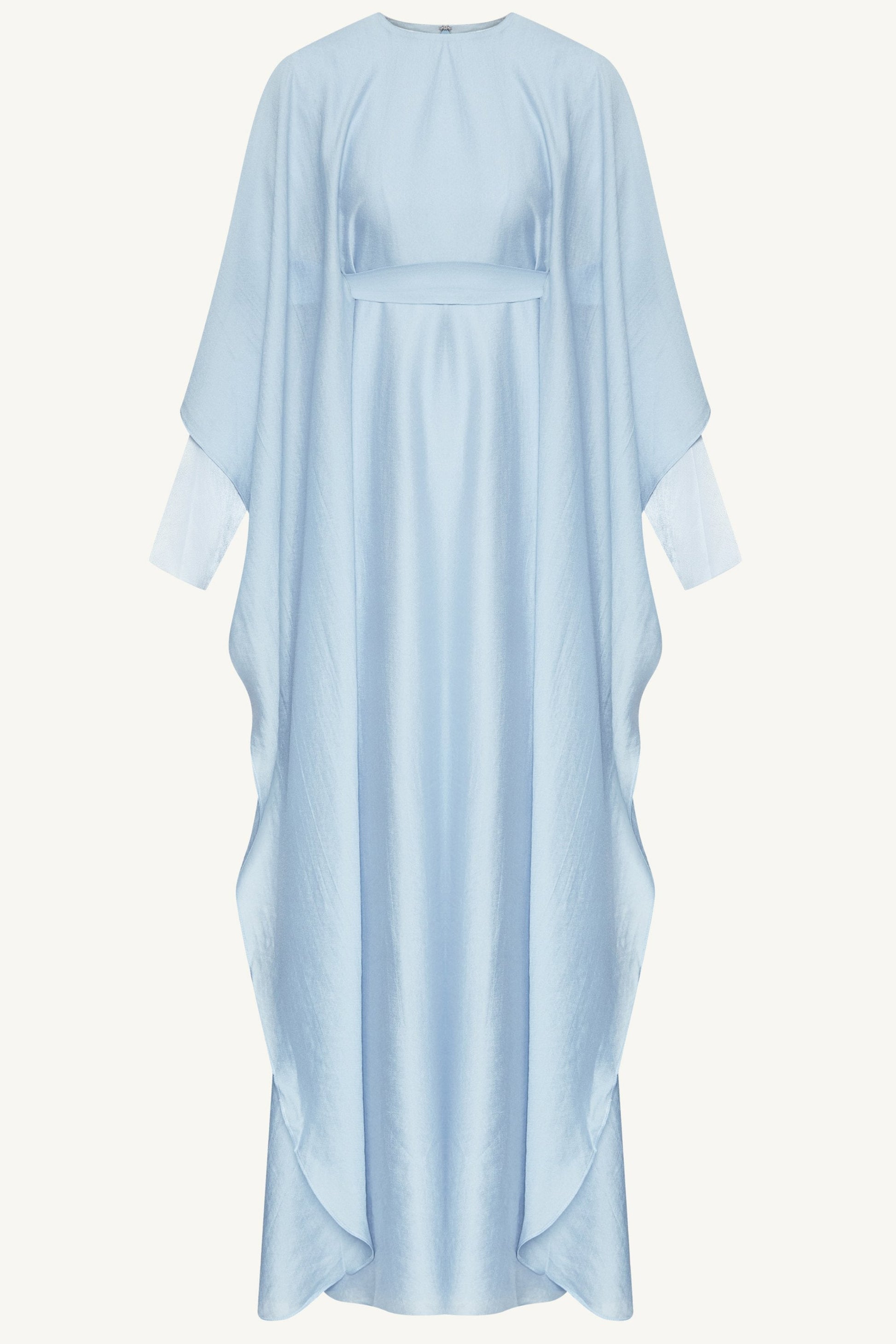 Embrace ethereal elegance with our Ethereal Silk Tie Waist Maxi Dress in stunning Pastel Blue. This luxurious dress features a flowy cape overlay and textured silk fabric, creating a dreamy look. The adjustable tie waist adds a flattering touch, making it the perfect choice for any special occasion.