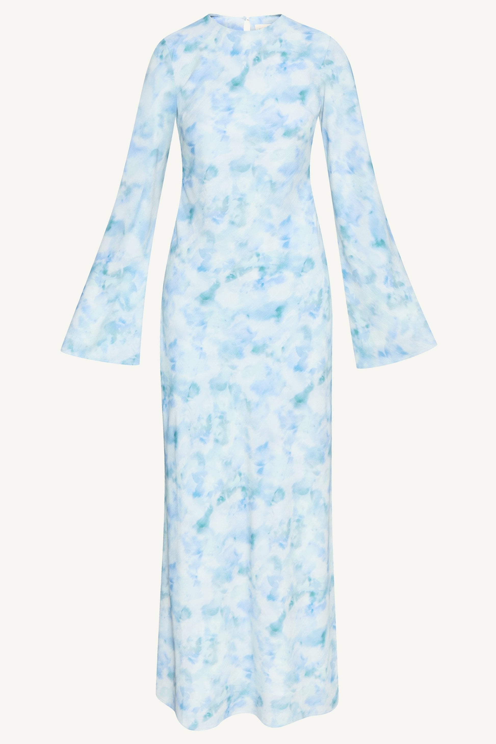 Elevate your style with our Lujain Printed Maxi Dress in Blue Watercolor. This stunning dress features a bias cut for a flattering fit, and a gorgeous watercolor print that is a work of art. The flare sleeves add an elegant touch to this exclusive piece.